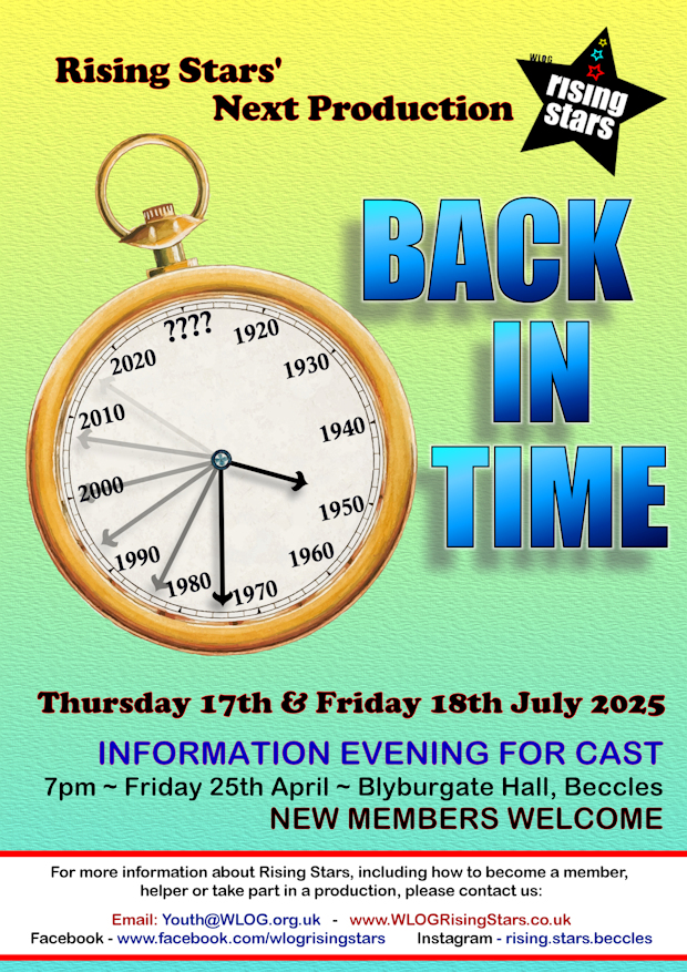 It’s your time to shine as WLOG Rising Stars begin their search for the cast of their next production Back in Time which will be performed in Beccles Public Hall & Theatre on the 17th & 18th July 2025.